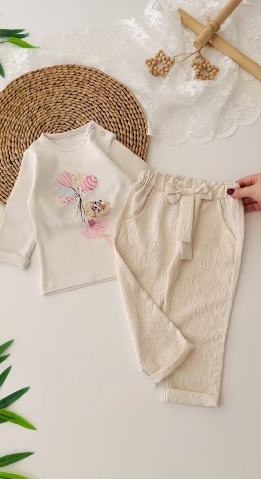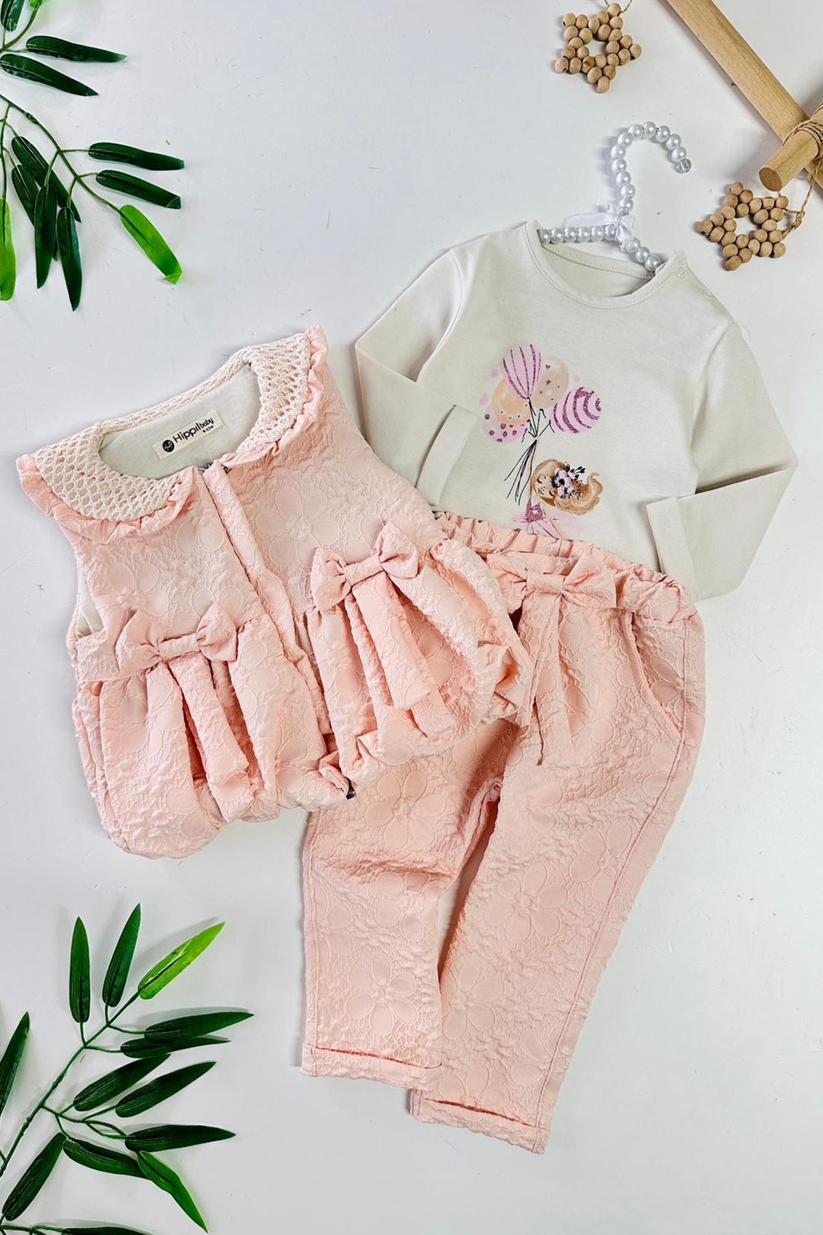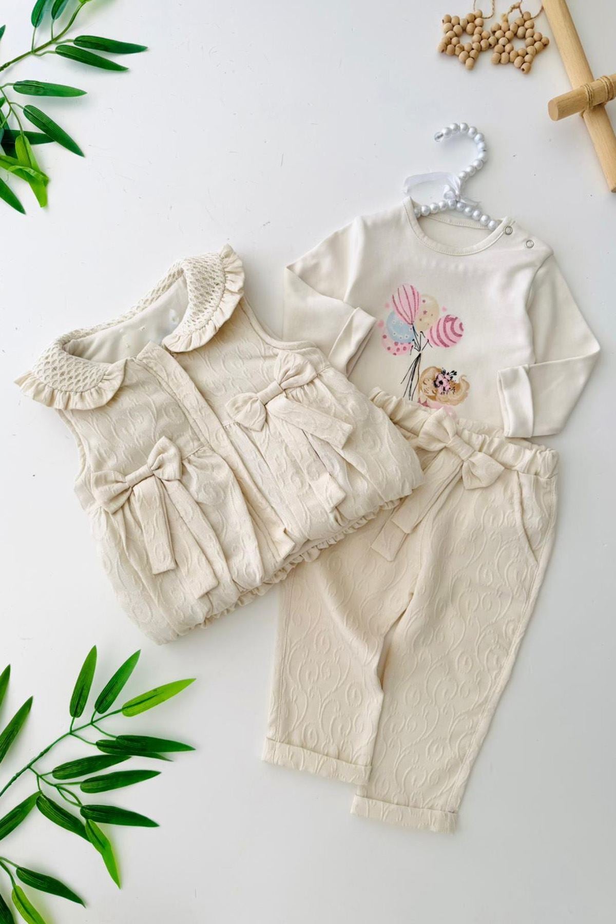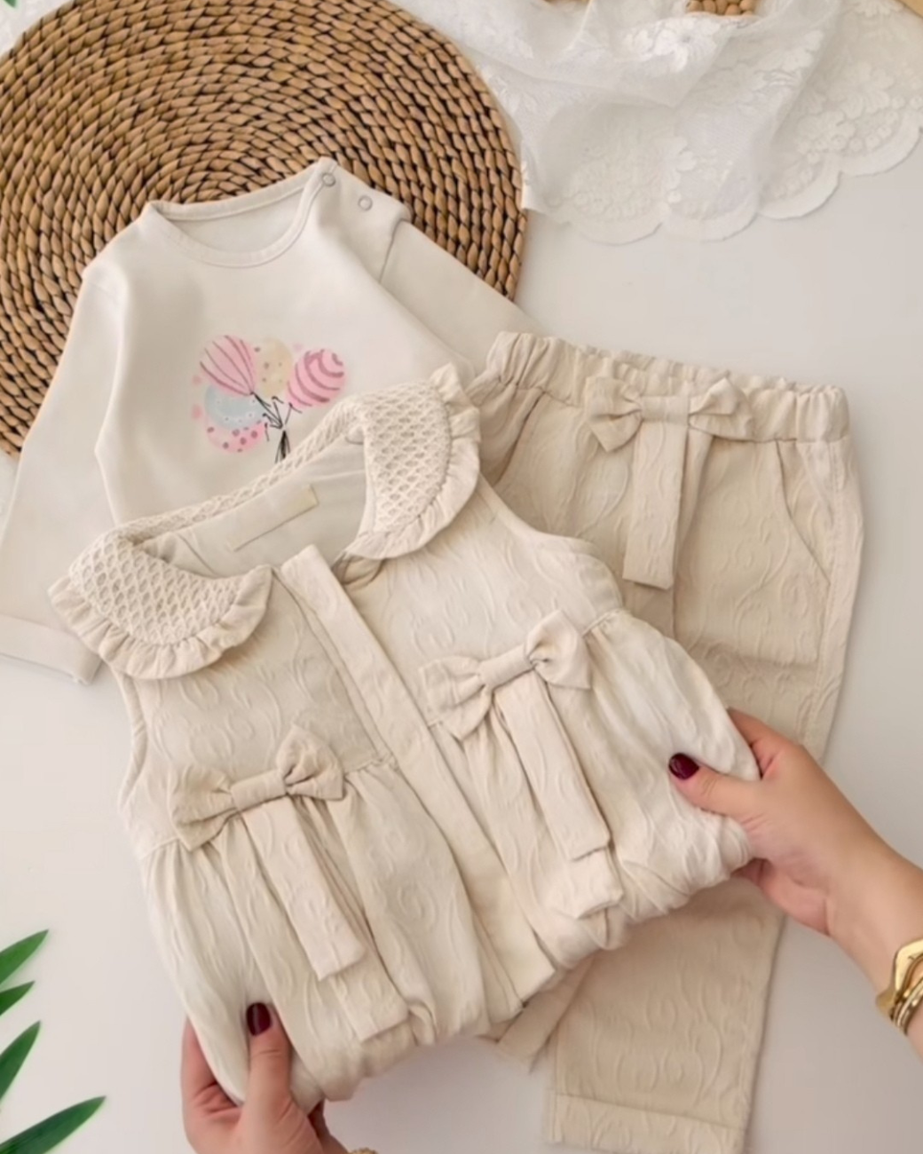 • طقم شتوي بناتي للرضع 3 قطع – بلوزة مع سترة أنيقة وبنطال بتفاصيل فيونكة راقية