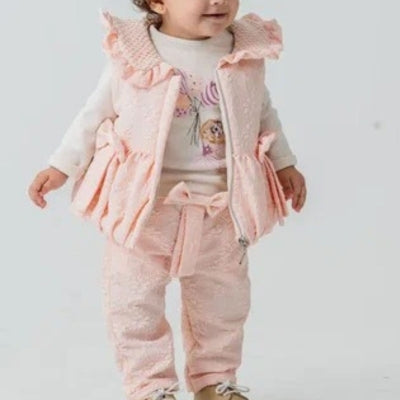 طقم شتوي بناتي للرضع 3 قطع – بلوزة مع سترة أنيقة وبنطال بتفاصيل فيونكة راقية