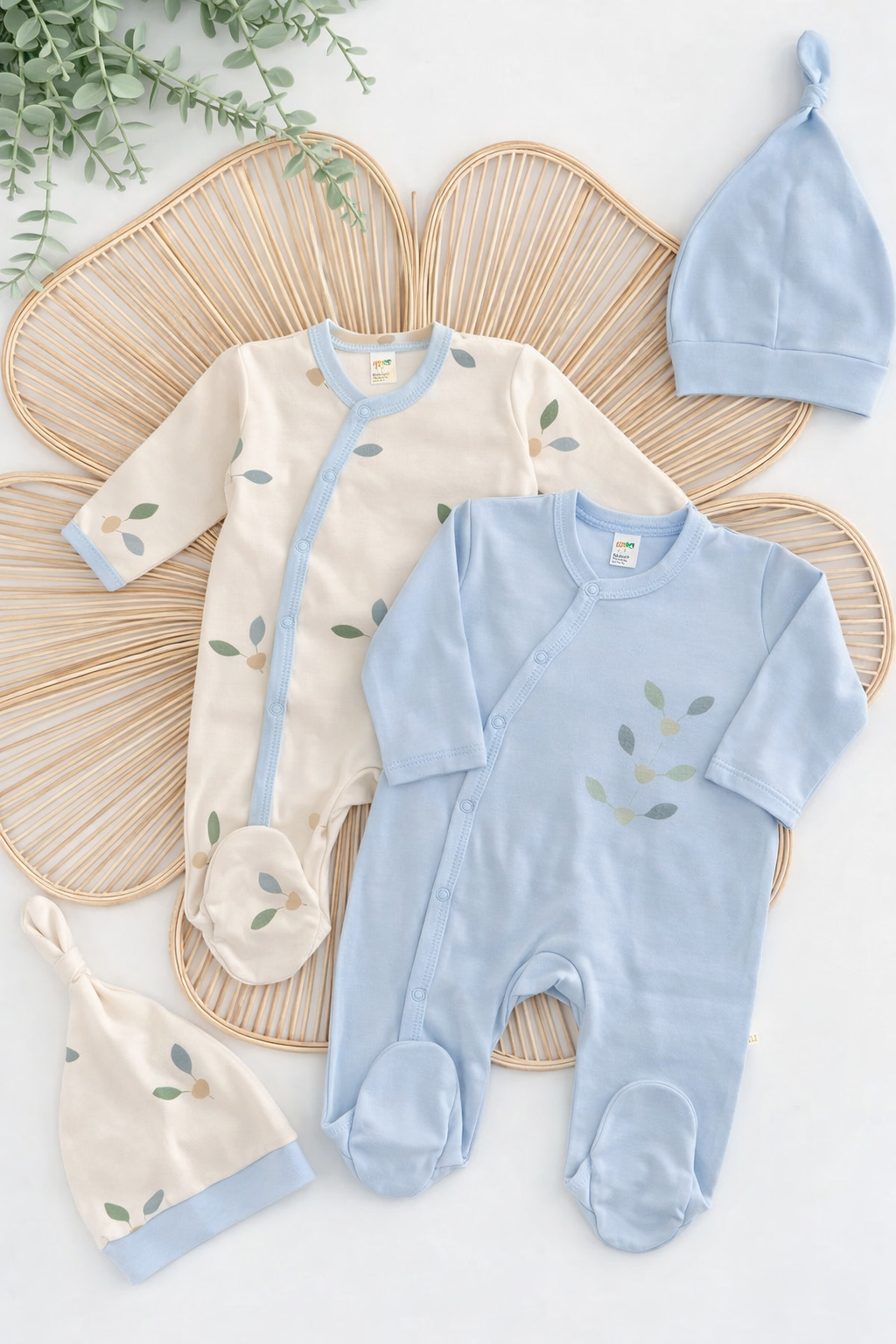 • طقم حديثي الولادة بطبعة أوراق لطيفة – قطعتان مع قبعة